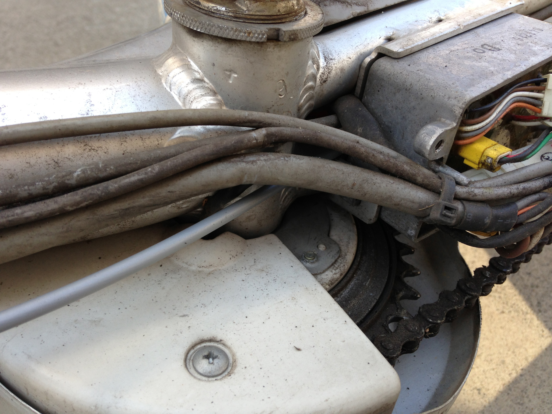 電チャリ(06年製サンヨーエナクル、2台)のシフトケーブル交換を行いました。ダイヤコンペの内装3段のケーブルで、シースがぼろぼろのところをテープ巻きで補強していましたが動作が怪しくなってきたので、通販でワイヤーを購入し交換しました。