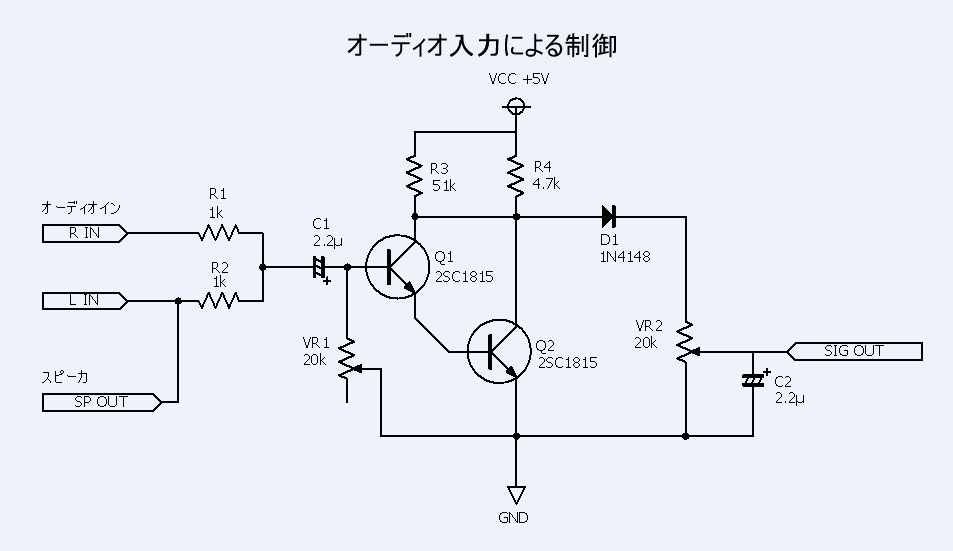 オーディオ入力回路(試作版)です。PWM回路のLED常点灯調節入力のボリュームを外してつなぎます。私はコネクタで切替できる様にしました。