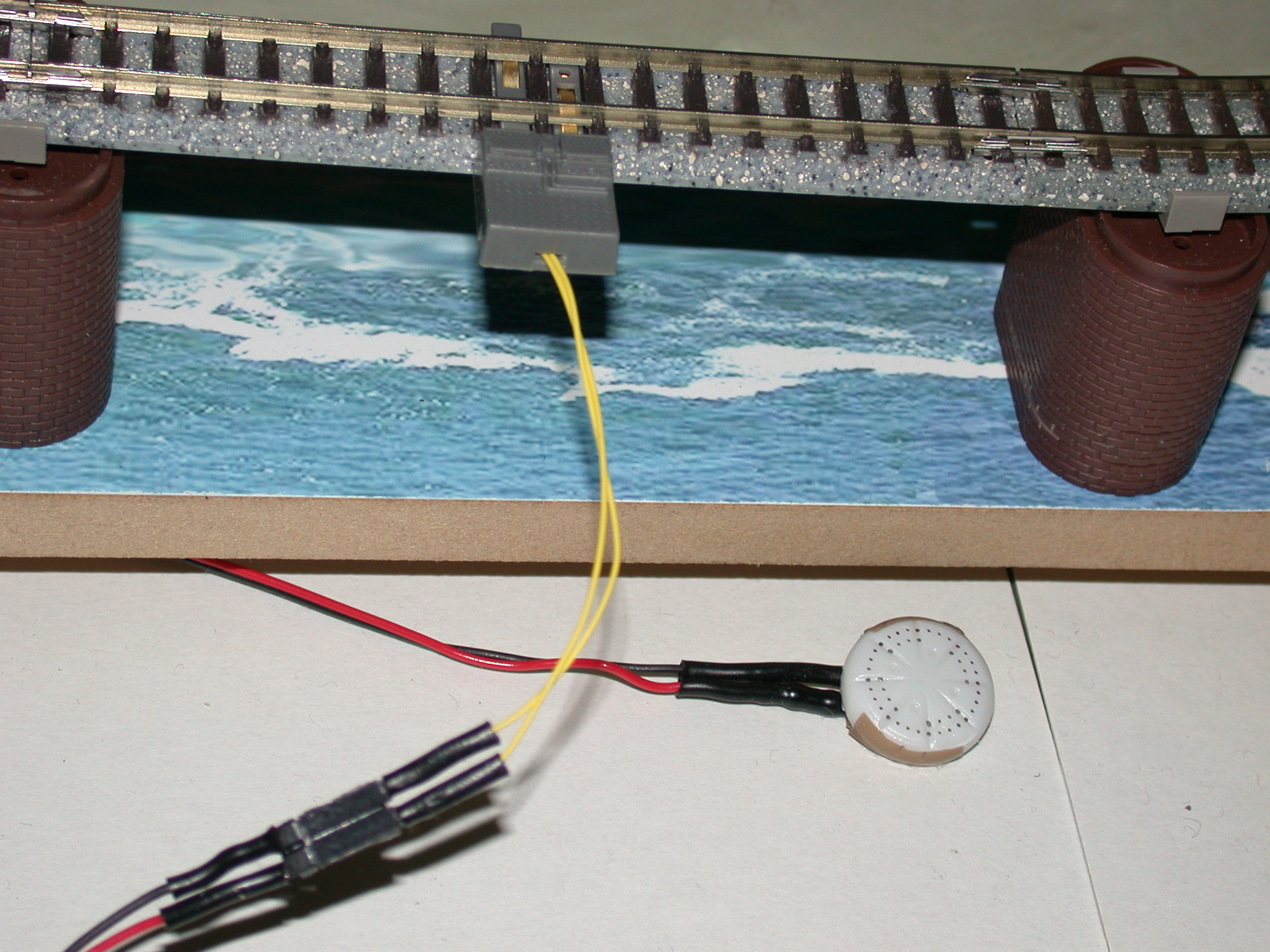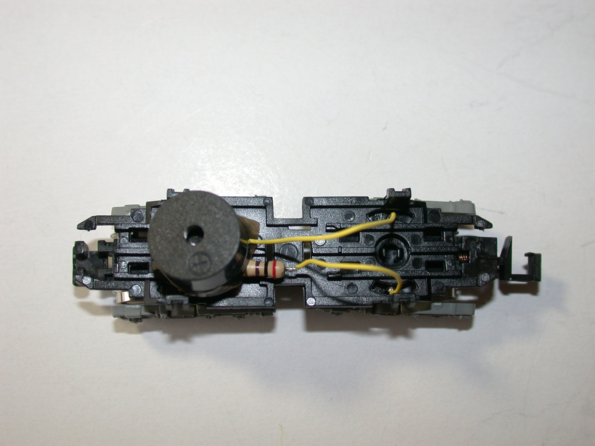 「しろくま」さんのコントローラは色々な音が出せて面白いのですが、車両(モーター車)によって音が小さい(ほとんど聞こえない)場合や、走行ノイズにかき消されやすいので、スピーカー車両を作製しました。抵抗で音量の調節が可能です。結構、大きな音が出せます。